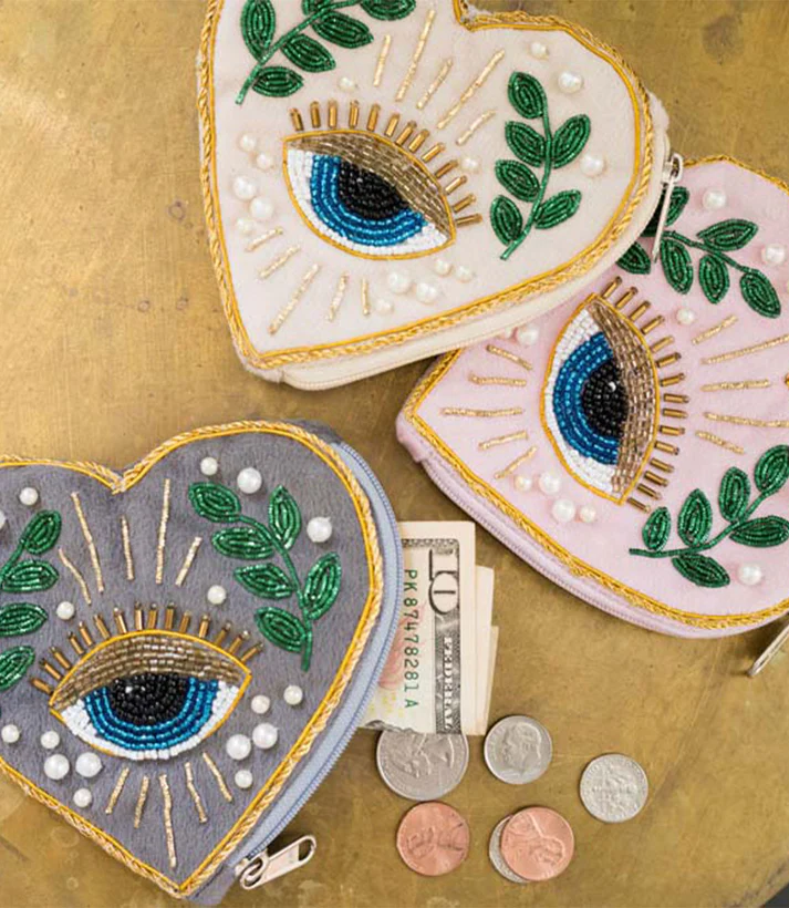 The Manku Beaded Coin Purse is a heart-shaped velvet pouch featuring pearl accents, floral beading, and an eye motif for a touch of symbolic charm. Large enough to fit credit cards, it’s both pretty and practical. Perfect for gift shops, accessory boutiques, and stores that highlight handmade or boho-chic styles. This coin purse is a great grab-and-go gift with visual appeal and functional design.